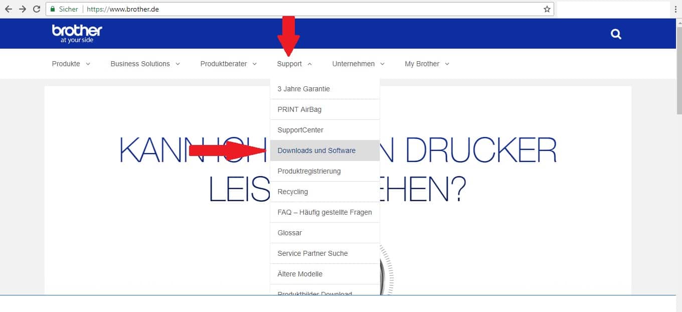 Möchten Sie den aktuellen Treiber für Ihren Drucker herunterladen, müssen Sie zunächst die Seite des Herstellers aufrufen. Hier finden Sie den Reiter „Support“, der Ihnen diverse Möglichkeiten der Hilfe anzeigt. So können Sie hier auch auf „Downloads und Software“ klicken und gelangen auf diesem Weg in das Brother Solutions Center.